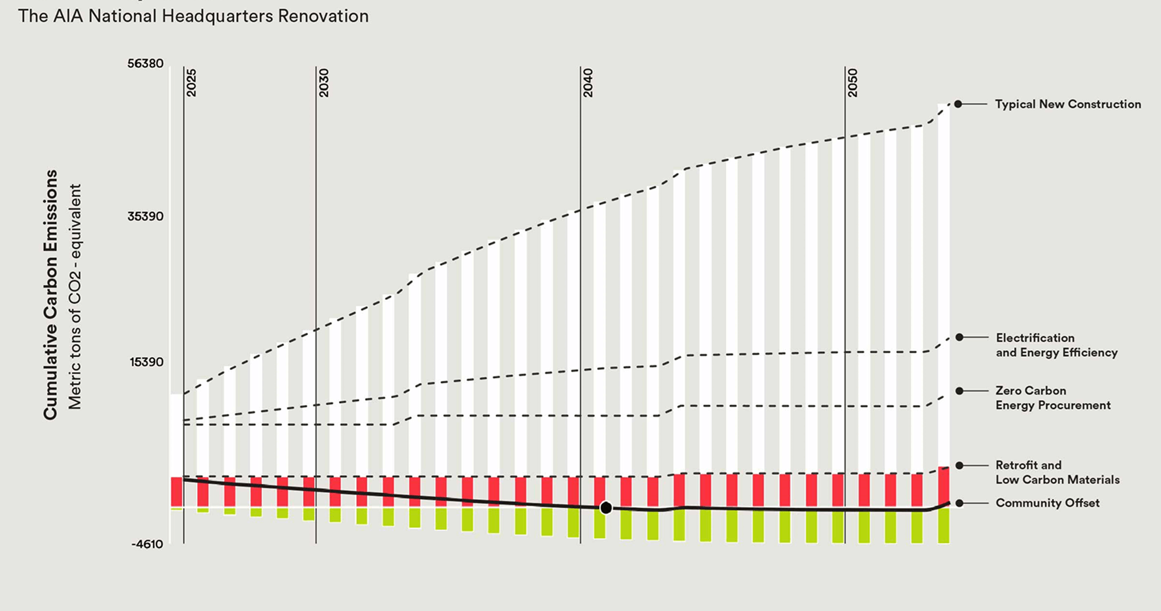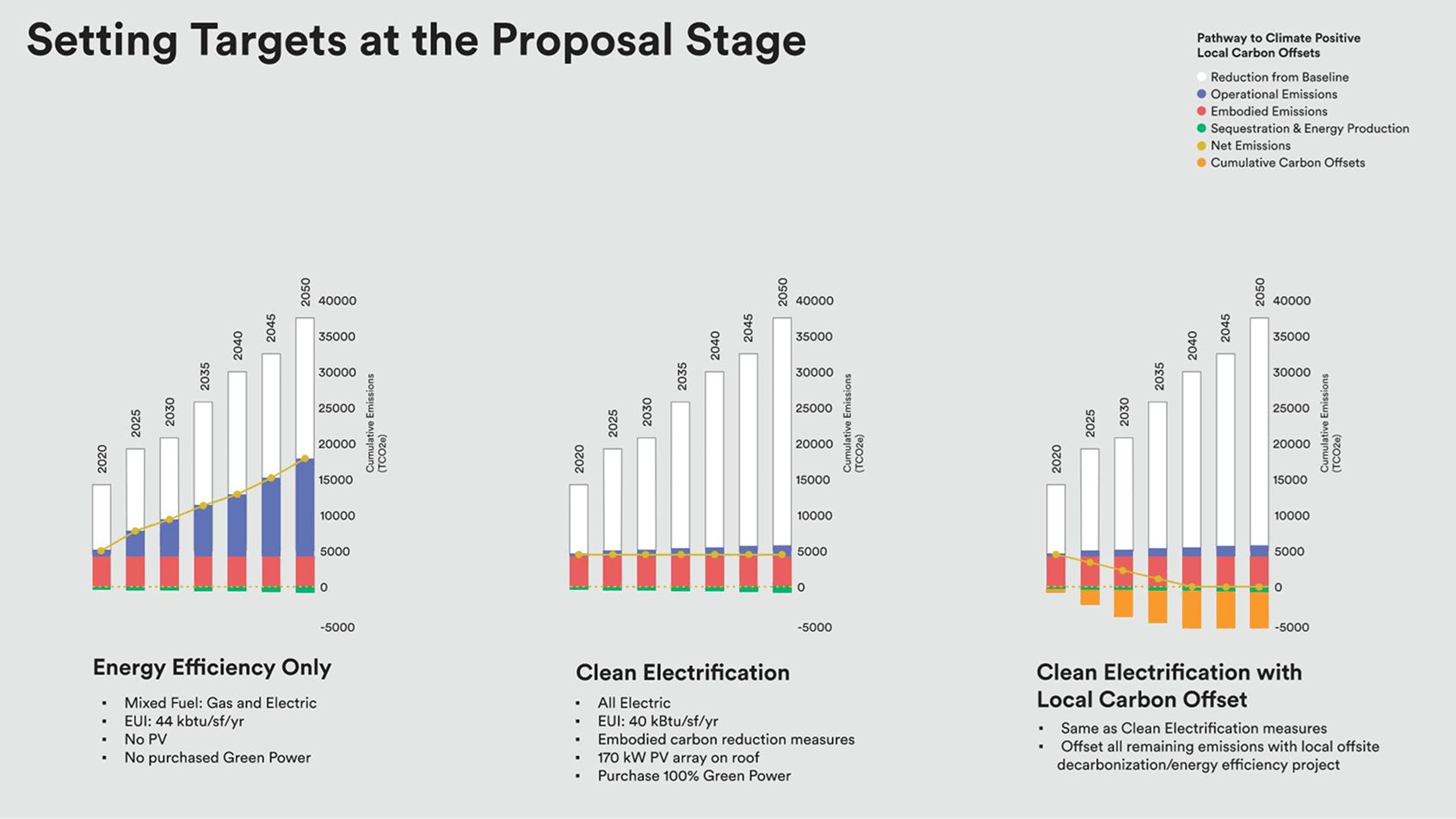 Building electrification coupled with purchased 100% renewable electricity is visualized as a building design strategy, side by side with efficiency and low carbon materials.